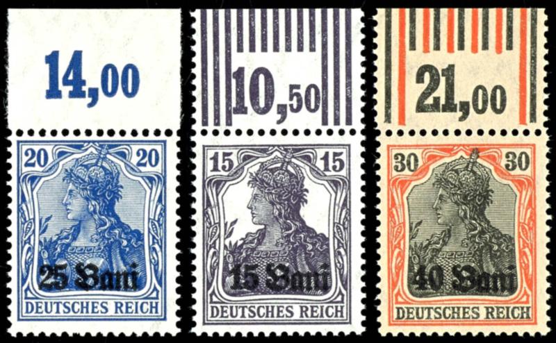 15 Bani on 15 pfennigs to 40 Bani on 30 pfennigs. set complete, perfect mint never hinged, unsigned. all 3 stamps in horizontal pairs from lower margin with HAN. photo expertize Berend Hey BPP "faultless, mint never hinged. " for number 3. Michel 280.- (1/3HAN) (page)