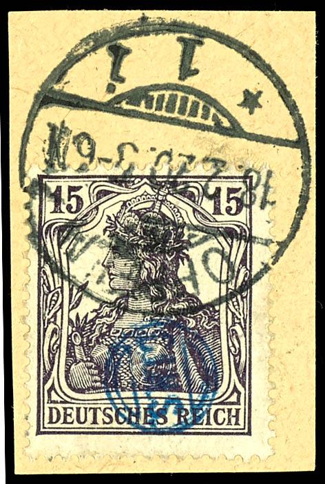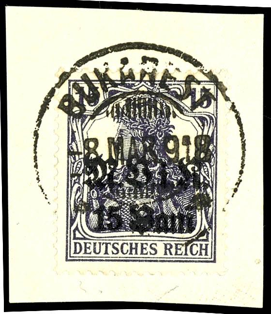 15 Bani on 15 pfennigs Germania in of the rare colour black violet, neat cancelled "Bucharest" on piece, photo expertize Heinrich Wasels BPP "genuine, perfect", Michel 170.- (5a) Certificate 15 Ban