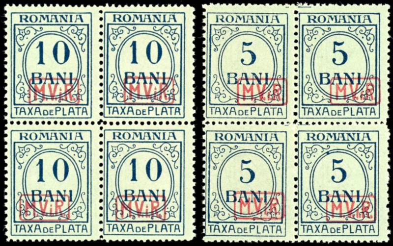 5 Bani and 10 Bani with red typography overprint, set in blocks of four, mint never hinged, very fine, Michel 480.- (6/7(4)) 5 Bani und 10 Bani mit rotem Bdr.-Aufdruck, Viererblocksatz, postfrisch, tadellose Erhaltung, Mi. 480.-