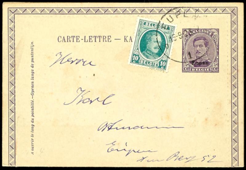 15 C letter-card with 10 C additional franking without overprint, clean used in the local usage EUPEN 15.9.23 with a lot of text, careful opened with full border bars (K3,Belgien) 15 C Kartenbrief mit 10 C Beifrankatur ohne Überdruck, sauber verwendet im Ortsverkehr EUPEN 15.9.23 mit viel Text, v