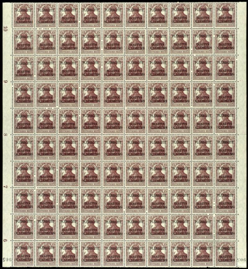 15 pfennigs Germania dark brown-carmine with high vertical overprint, so-called victory stamp in the coil stamps sheet to 100 values, roller press web nummer "905" at the left margin of sheet, vertical and horizontal centered folded - horizontal therefore separated, the right side margin slight crea
