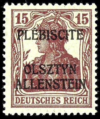 15 pfennigs Germania dark brown-carmine with high vertical overprint, so-called victory stamp, perfectly mint never hinged, photo expertize Wasels BPP (2024) "genuine, perfect", Michel 110.- (4aI) Certifi