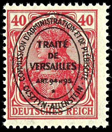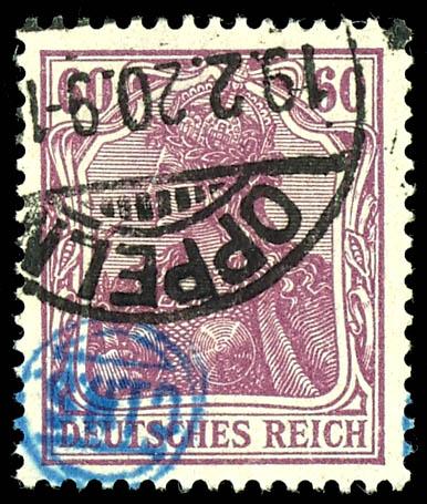 2, 50 Fr. on 2 Mark German Reich, 25: 17 perforation holes, scarce colour blackish ultramarine, plate flaw I "break in crown left", cancelled "post auditing agency 33 (* b *) 25. February 1918", very fine, photo expertize Heinrich Wasels BPP "the condition of the stamp is perfect. ", Michel 1.500.-