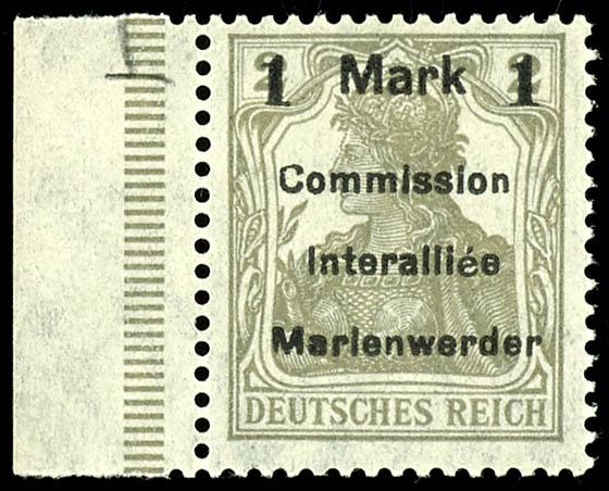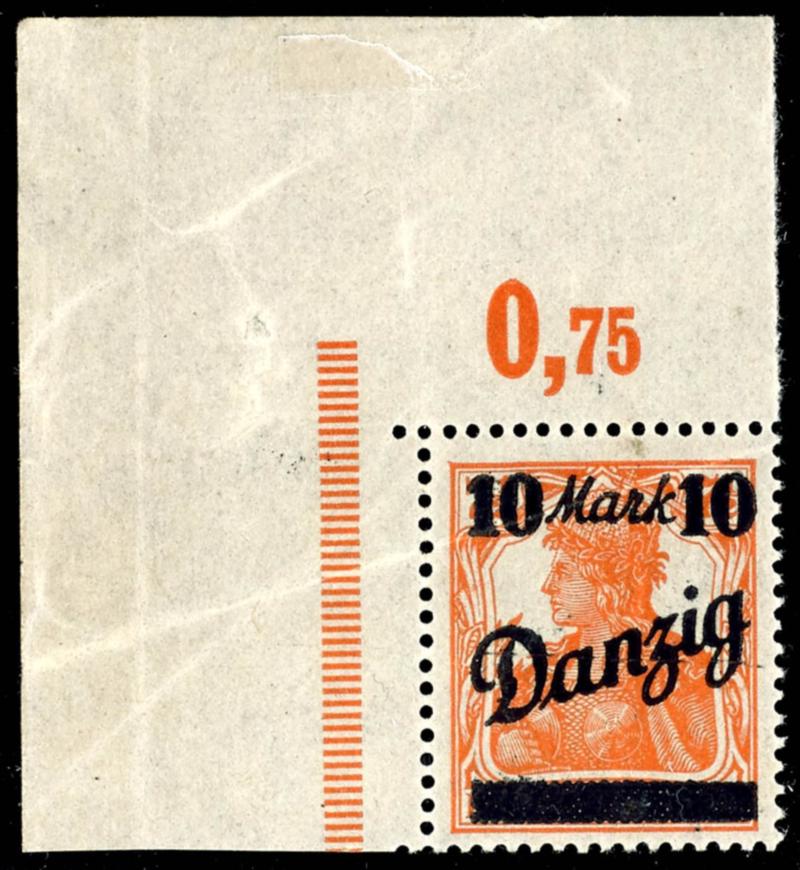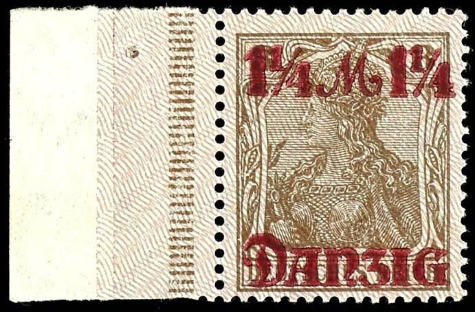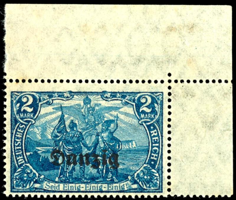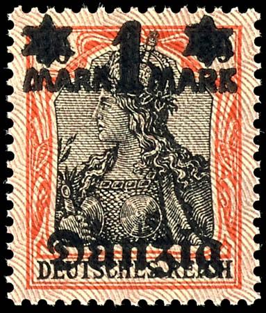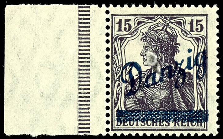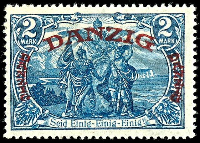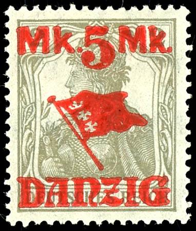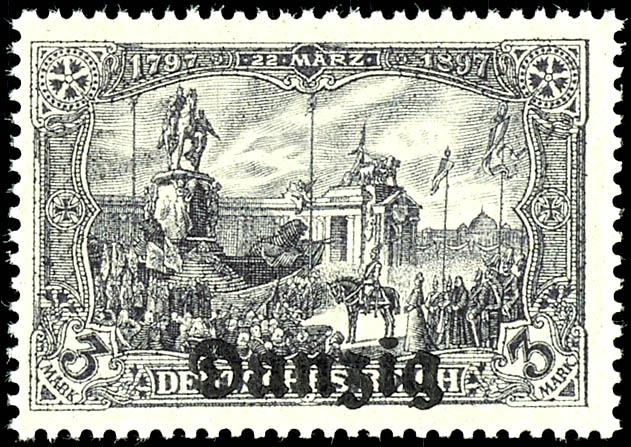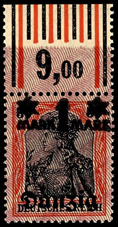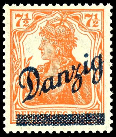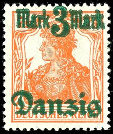 3 Mark on 7 1 / 2 pfennigs Germania, sound unused, with overprint flaw i in Gdansk at the bottom oblique broken (field 76), photo expertize Gunnar Gruber BPP, "genuine and in perfect quality", Michel - . (44IIAFII) (page)