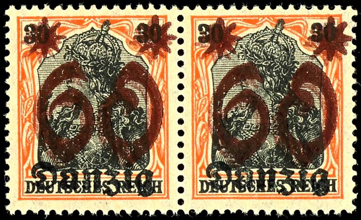 60 on 30 pfennigs, horizontal pair, double overprint, once feebler, mint never hinged, perfect, Michel 200.- (19DDII) 60 auf 30 Pfennig, waagerechtes Paar, Doppelaufdruck, einmal schwächer, postfrisch, einwandfrei, Mi. 200.-