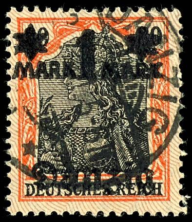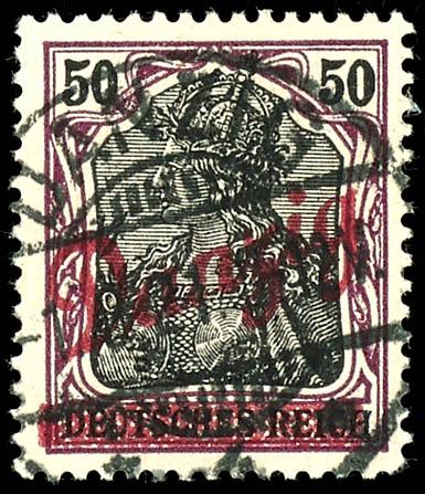 50 cent on 40 pfennigs Germania, carmine red, overprint close between distance, used, very fine, expertized Dr. Hochstaedter BPP, Michel 400.- (20bI) 50 Cent auf 40 Pfennig Germania, karminrot, Aufdruck enger Zwischenabstand, gestempelt, tadellose Erhaltung, geprüft Dr. Hochstädter BPP, Mi. 400.-