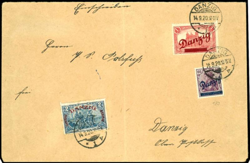 60 pfennigs to 2 Mark "high values only for franking by the postal service", complete set with three values, date-appropriate cancelled "Gdansk * 1 v 14.9.20.10-11 V" on marked cover, cover vertical crease and reverse opening deficiency, 2 Mark from gum a little glassy perf tips - no defects, photo