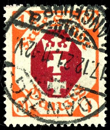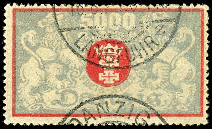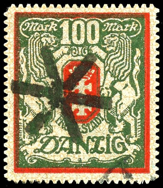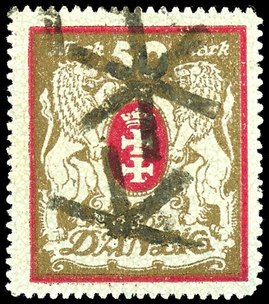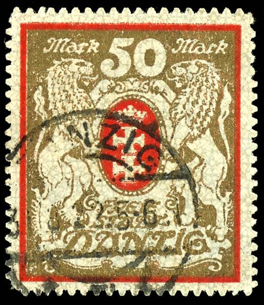 50 M. large coat of arms watermarked 2 X, date-appropriate cancellation with security post cancel (post office 1 Gdansk package card invalidation), very fine, photo expertize Gruber BPP "the stamp is genuine and in perfect quality. ", Michel 300.- (100Xb) (page)