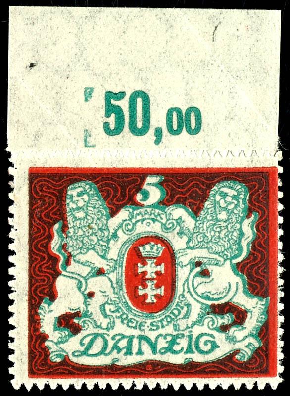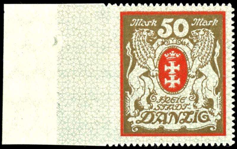 50 Mark municipal coat of arms red / gold with vertical watermark 2 X, date-appropriate cancelled "Gdansk * 5 t 31.8.22 5-6 N", very fine, photo expertize Gunnar Gruber BPP "in perfect quality. ", Michel 800.- (100Xa) (page)