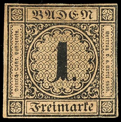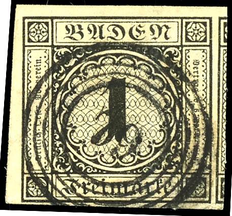 1 Kreuzer schwarz auf sämisch, allseits voll- bis überrandig geschnitten, aus der linken oberen Bogenecke mit 1 - 1,5 mm Rand oben und 1 - 2 mm Rand links, zentrisch entwertet mit Fünfringstempel "79" - Lahr, abgesehen von einer leichten senkrechten Bugspur in tadelloser Erhaltung, Fotoattest Stegmü