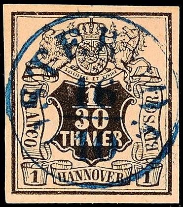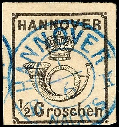 1/2 Gr. schwarz, weiße Gummierung, dreiseitig breitrandig, unten vollrandig, gestempelt mit klarem zentrischen blauen K2 "HANNOVER B.K. NACHTS", Kabinettstück, gepr. Pfenninger, Mi. 250.-1 / 2 Gr. Black, white gum, three sided with wide margins, at the bottom full margins, used with clear centere