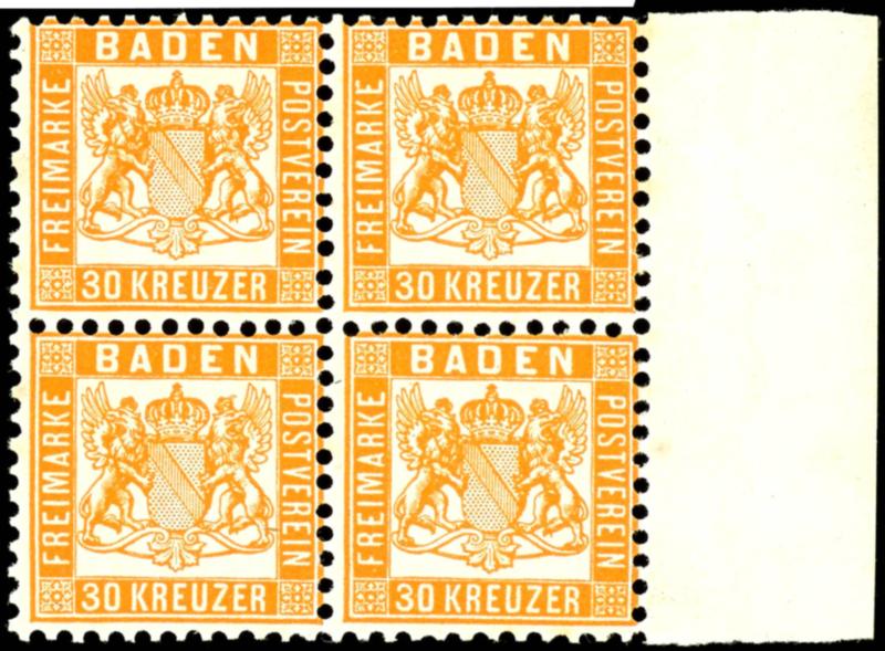30 Kreuzer dunkelgelblichorange, postfrischer Viererblock vom rechten Seitenrand, min. Stockfleckchen, Fotobefund Brettl BPP, Mi. 450.-30 kreuzer dark-yellowish-orange, mint never hinged block of four from right margin, minimal little stain, photo expertize Brettl BPP, Michel 450.- (22b(4)) (page)