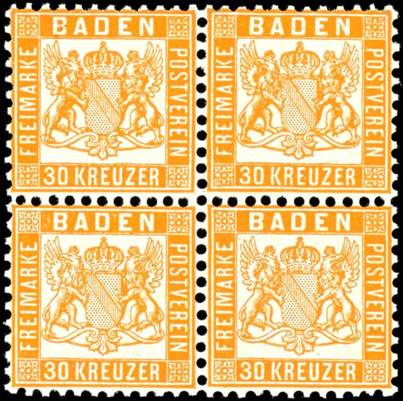 30 Kreuzer dunkelgelblichorange, Viererblock (waagerecht gefaltet), postfrisch, tadellos, unsigniert, Mi. 450.-30 kreuzer dark-yellowish-orange, block of four (horizontal folded), mint never hinged, impeccable, unsigned, Michel 450.- (22b(4)) (page)