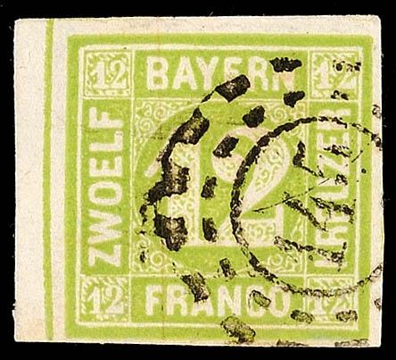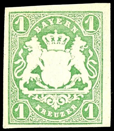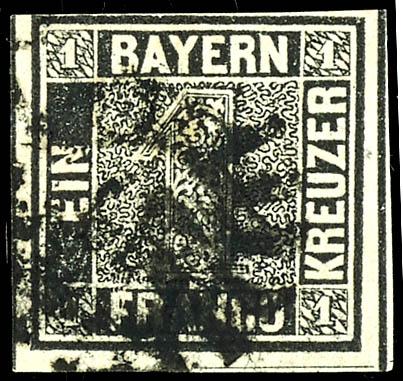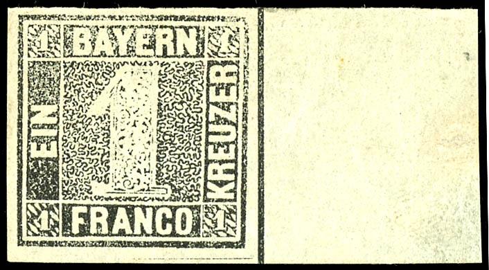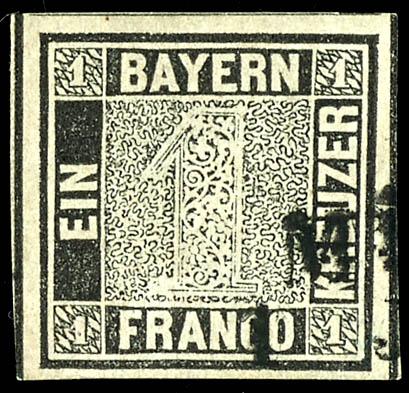 1 Kreuzer schwarz, Platte 1, voll- bis breitrandiges Kabinettstück, entwertet mit Zweizeiler "MÜ(NCHEN ...", gepr. Drahn und Fotoattest Sem BPP (2023): "einwandfrei erhalten. Gut gerandeter "Schwarzer Einser"."1 kreuzer black, plate 1, full to wide margins extremely fine copy, tied by two line ca