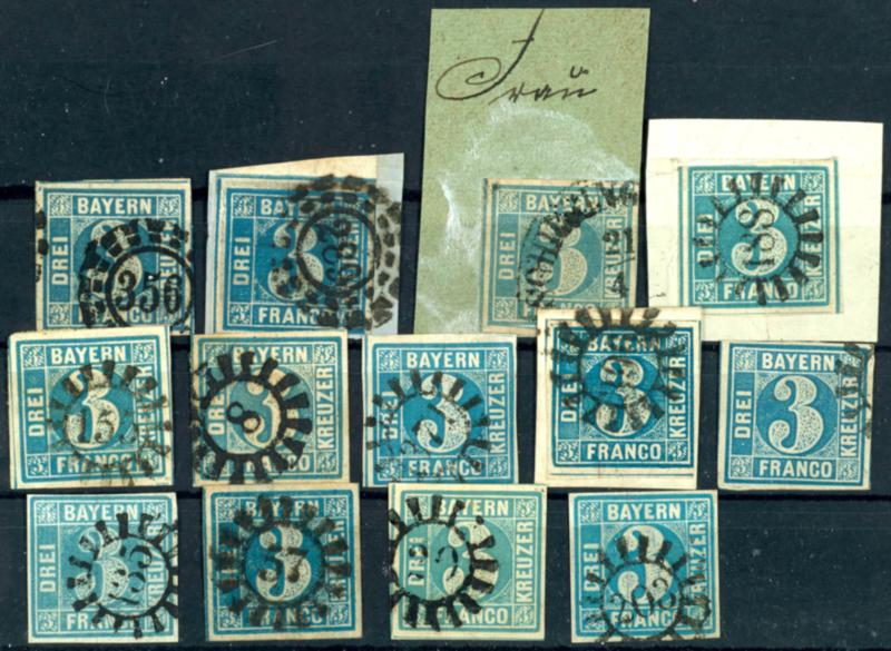 3 Kreuzer blau 13 mal tadellos gestempelt Kabinett in Type I oder II, dabei 3 Briefstücke3 kreuzer blue 13 time neat cancelled superb in every respect (choice copy) in type I or II, as well 3 letter pieces (2I,II(13)) (page)