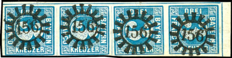 3 Kreuzer blau, Platte 2,senkrechter 4er-Streifen mit kleinem Oberrand, jede Marke zentrisch und glasklar gestempelt gMR "156" - Kipfenberg, links überrandig mit kompletter Schnittlinie, die untere Marke rechts unten leicht berührt, das obere Paar jedoch mit angesetztem rechten Rand (und dort Randli
