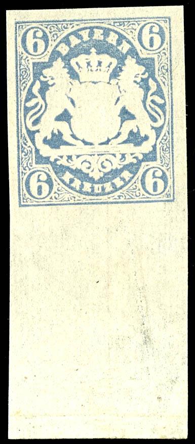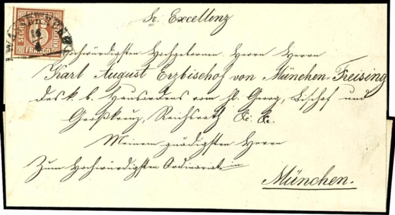 6 Kreuzer braun, Type I, ringsum breitrandig mit zweiseitig durchgehenden Trennungslinien auf Bischofsbriefhülle an Karl August in München adressiert, entwertet mit Halbkreisstempel "Wasserburg 16/4" (1850) in aktenfrischer Luxuserhaltung, Fotoattest Peter Sem BPP "Einwandfrei erhalten. Sogenannte B