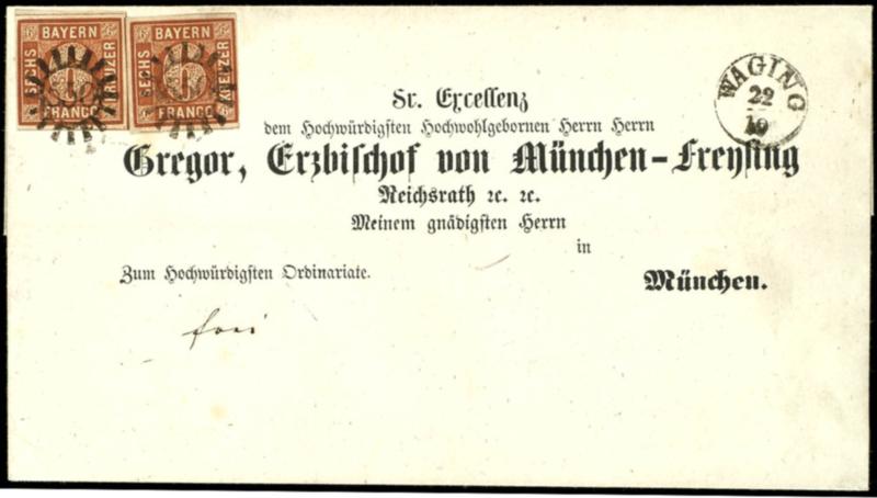 6 Kreuzer braun, Type II von Platte 3, zwei Exemplare im Paar geklebt auf vorgedruckter Bischofsbriefhülle an Gregorius (von Scherr), Erzbischof von München-Freising (Menzinger 5b), beide Werte ringsum breitrandig mit meist durchgehenden Trennungslinien, je klar entwertet mit oMr "550" - Halbkreis-N