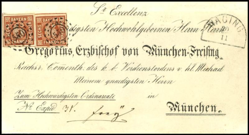 6 Kreuzer braun, Type II von Platte 2, zwei Exemplare im Paar geklebt auf vorgedruckter Bischofsbriefhülle an Gregorius (von Scherr), Erzbischof von München-Freysing (ähnlich Menzinger 6a), beide Werte ringsum breitrandig mit meist durchgehenden Trennungslinien, je klar entwertet mit oMr "550" - Fin