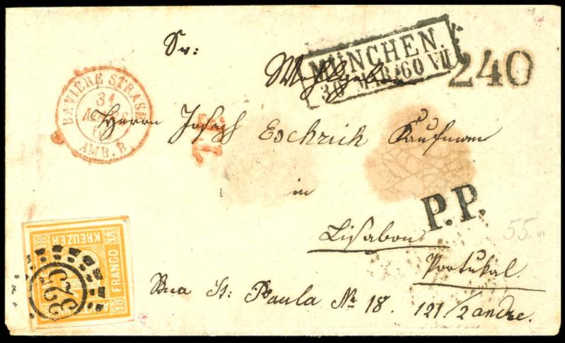 18 Kreuzer gelblichorange, allseits sehr breitrandiges Exemplar vom oberen Bogenrand mit oMr "325" als Einzelfrankatur auf portogerechtem Brief von "MÜNCHEN 30 MAR 60 VII" nach Lissabon! Für die Beförderung durch Spanien und Portugal musste der Empfänger weitere 240 Reis bezahlen, entsprechender Tax