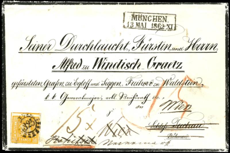 18 Kreuzer gelborange, farbfrisches und ringsum breit- bis überrandiges Kabinettstück mit voll aufsitzendem oMr "325" in tarifgerechter Einzelfrankatur auf kalligraphisch adressiertem Trauer-Kuvert MÜNCHEN 13 MAI 1862 an den Fürsten Alfred zu Windisch-Graetz auf Schloss Tachau in Böhmen, weitergelei