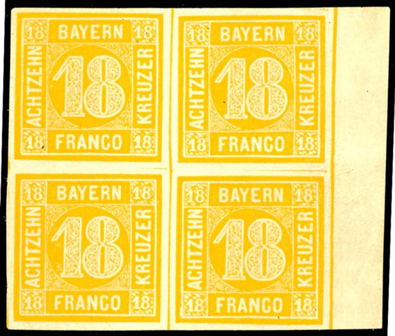 18 Kreuzer gelborange, Viererblock vom rechten Bogenrand (7 mm), farbfrisches und voll- bis breitrandig geschnittenes Kabinettstück, ungebraucht mit Originalgummierung mit Falzresten, Fotoattest Sem BPP (2022): "einwandfrei erhalten. Farbfrischer Rand-Viererblock."18 kreuzer yellow orange, block