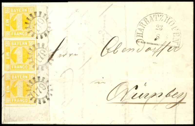 1 Kreuzer gelb, Plattentyp 1, senkrechter Dreierstreifen aus der rechten unteren Bogenecke stammend mit 7 - 8 mm Rand rechts und 10 mm Rand unten, als einmalige Frankatur auf Brief von "179" Harbatzhofen 23 8 (1865) nach Nürnberg, abgesehen von einem waagerecht verlaufenden Briefbug durch die untere