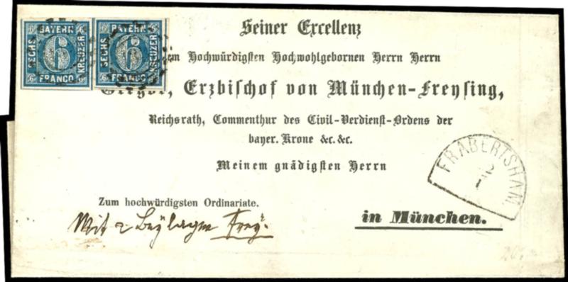 6 Kreuzer blau, zwei Exemplare im Paar geklebt auf vorgedruckter Bischofsbriefhülle an Gregorius (von Scherr), Erzbischof von München-Freysing (ähnlich Menzinger 6d), beide Werte ringsum breitrandig mit meist durchgehenden Trennungslinien, je klar entwertet mit oMr "133" - Halbkreis-Nebenstempel "Al