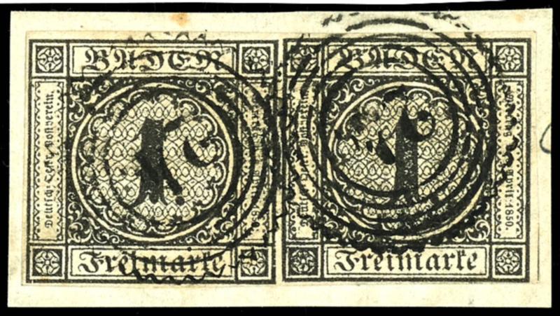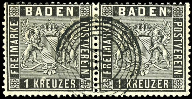 1 Kreuzer schwarz, waagerechtes Paar, farbfrisches und vollzähniges Kabinettstück,. entwertet mit Fünfringstempel "84" - Lörrach, gepr. Englert BPP, Mi. 300.-1 kreuzer black, horizontal pair, having bright colours and perfect perforations extremely fine copy, . Tied by five ring stamp \"84\" - Lö