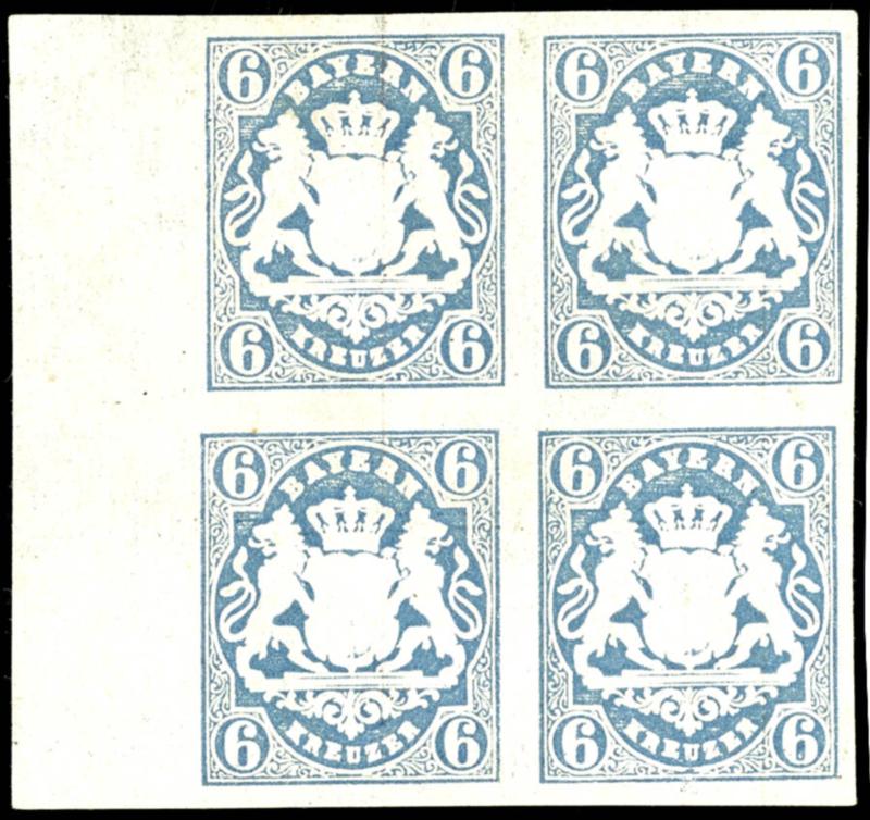 6 Kreuzer graublau, voll- bis breitrandig geschnittener Kabinettviererblock vom linken Bogenrand, drei Werte ungebraucht und die rechte untere Marke postfrisch, gepr. AD (Alberto Diena) und Bolaffi sowie Fotobefund Sem BPP (2022): "Einwandfrei erhalten. Hübsche Einheit in frischer Erhaltung."6 kr