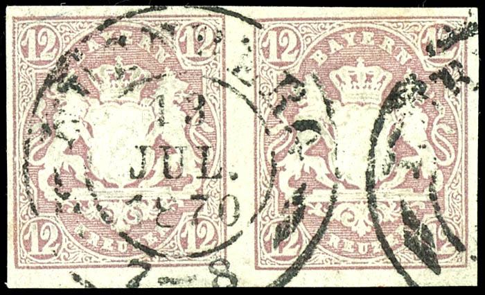 12 Kreuzer lila, waagerechtes Paar, allseits breitrandig, entwertet mit Dkr. "NÜRNBERG 12 JUL 1870", Kabinett, geprüft W. Engel, Fotobefund Brettl BPP, Mi. 650.-12 kreuzer lilac, horizontal pair, large margins all around, tied by double circle \"Nuremberg 12 JUL 1870\", superb in every respect (c