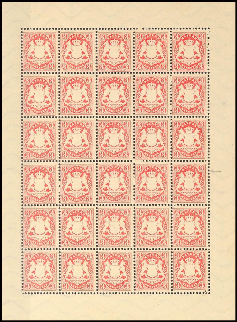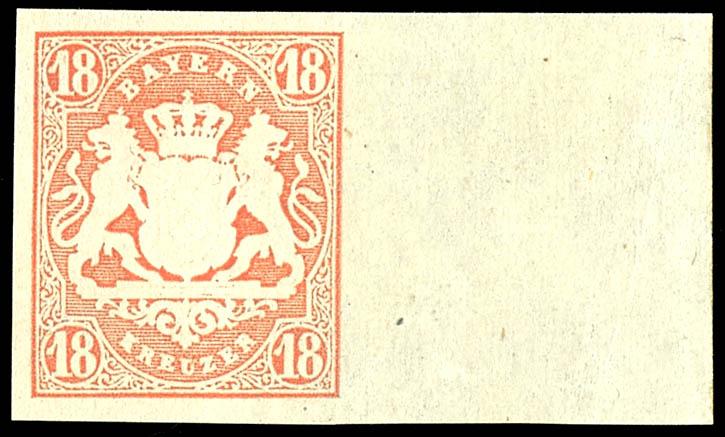 18 Kreuzer dunkelzinnoberrot tadellos postfrisch vom rechten Bogenrand und noch völlig unsigniert, Mi. 300.-18 kreuzer dark vermilion impeccable mint never hinged from right margin of sheet and still entirely unsigned, Michel 300.- (19) (page)