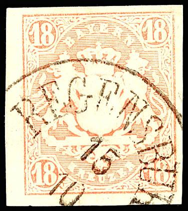 18 Kr. dunkelzinnoberrot, farbfrisch, voll- bis breitrandig, klarer K1 REGENSBURG, Altsignaturen Stolow und Graf Strachwitz, Mi. 220.-18 Kr. Dark vermilion, fresh colours, having full to wide margins, clear single circle postmark REGENSBURG, old signs Stolow and count Strachwitz, Michel 220.- (19