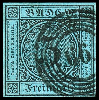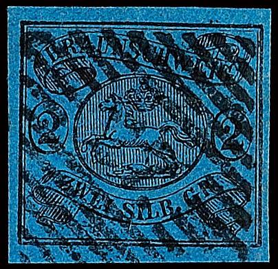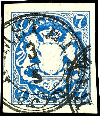 7 Kreuzer "Wappen", preußischblau, breitrandiges und farbfrisches Luxusstück, entwertet mit Dreikreisstempel "RAMSTEIN 3/5", unsigniert, Fotoattest Sem BPP (2022): "einwandfrei erhalten. Überdurchschnittlich geschnittene Marke mit besserem Ortsstempel."7 kreuzer \"coat of arms\", Prussian blue, w