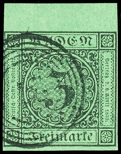 3 Kreuzer auf grün mit 5,5 mm breitem Oberrand, zentrisch gestempelt 5-Ring "24" - KARLSRUHE, links lupen-, sonst voll bis breitrandig, tadellose Erhaltung, derart breite Bogenränder sind selten, dekoratives Luxusstück, gepr. Seeger BPP3 kreuzer on green with 5, 5 mm wide upper margin, centric ca