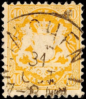 10 Kr. dunkelchromegelb, Wz. weite Wellenlinien, Kabinettstück mit K1 von "MÜNCHEN", gepr. Sem BPP "tadellos", Mi. 320.-10 Kr. Dark chrome yellow, watermark far waved lines, extremely fine copy with single circle postmark from \"Munich\", expertized Sem BPP \"impeccable\", Michel 320.- (35) (page)