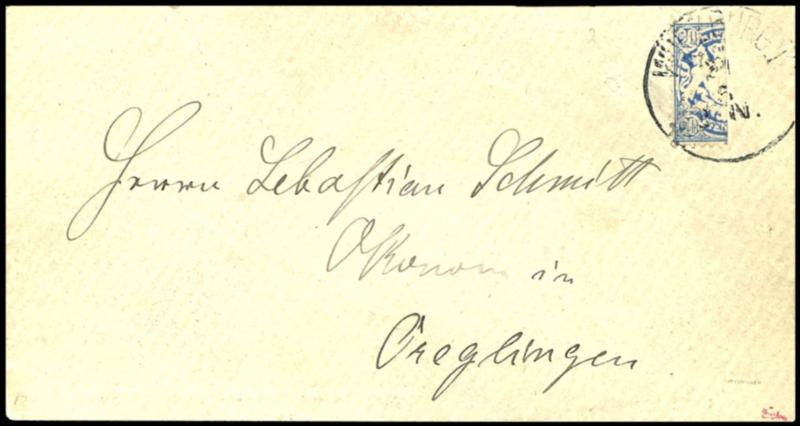 20 Pfennig Wappenausgabe senkrecht halbiert, linke Hälfte in unbeanstandeter, tarifrichtiger 10 Pfennig Verwendung, sehr gut gezähnt und ideal zentrisch gestempelt "WÜRZBURG I 21 5" (1883) auf ursprünglich erhaltenem Bedarfsbrief nach Greglingen in Württemberg mit rs. Ank.-Stempel. gepr. Drahn und P