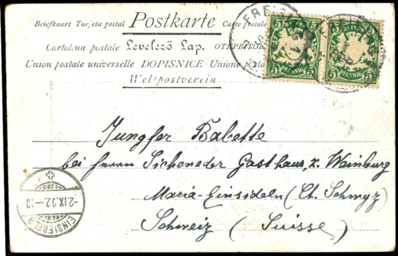 5 Pfennig Wappenausgabe, Wz. 3 senkrechte Wellen, waagerechtes Paar als tarifgerechte Frankatur auf Auslandspostkarte von Freilassing in die Schweiz, tadellos, Fotoattest Dr. Helbig BPP: "echt und fehlerlos. Paare dieser seltenen Marke sind bisher auf Postkarte nur in ganz wenigen Stücken registrie