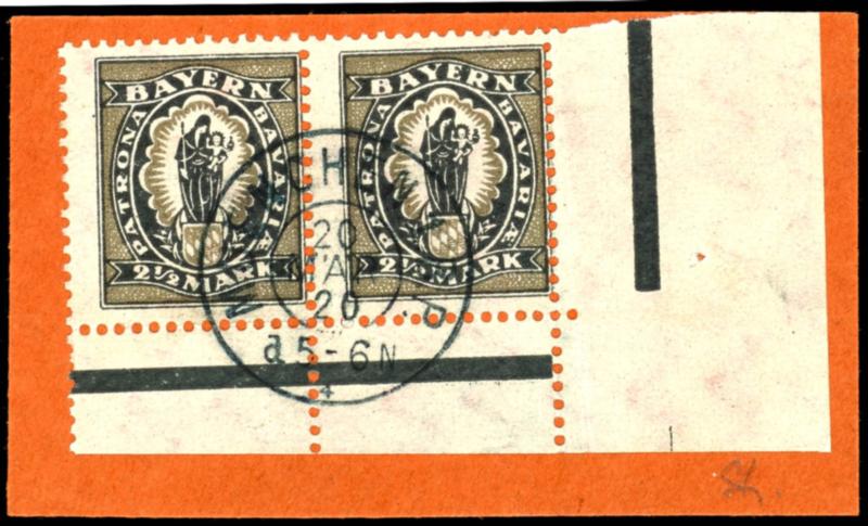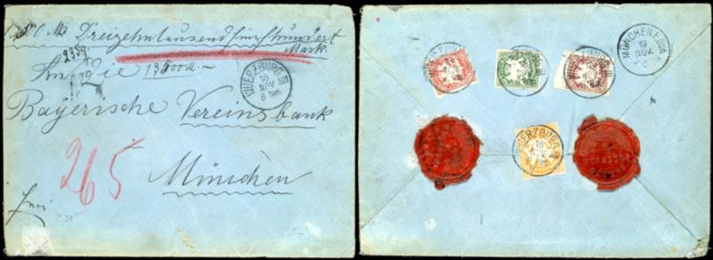 2 Mark orange mit Zusatzfrankatur 5 Pfg, 10 Pfg und 50 Pfg rückseitig auf gesiegeltem Leinen-Wertbrief (Wert 13.500.- Mark) von Würzburg nach München, Umschlag Gebrauchs- und Altersspuren, sehr seltene Frankatur, ex Sammlung Eduard Peschl, Fotoattest Helbig BPP2 Mark orange with additional franki