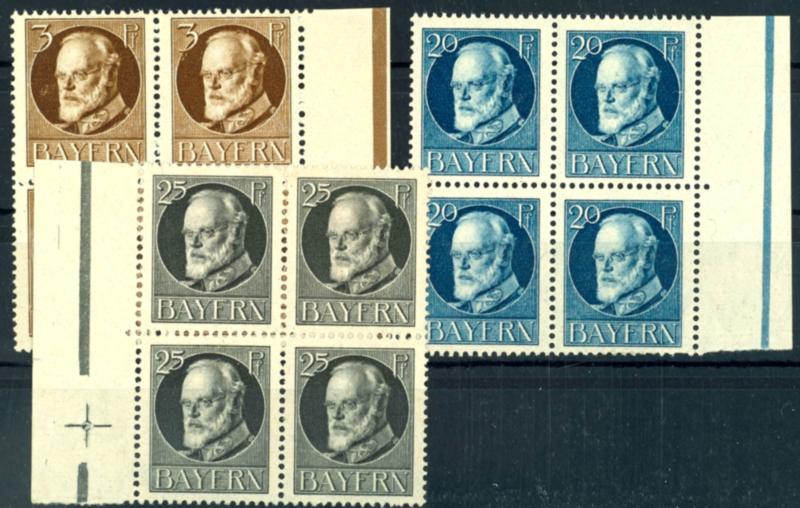 3, 20 und 25 Pf König Ludwig Friedensdrucke je im tadellos postfrischen Rand-Viererblock, Mi. 336.-3, 20 and 25 Pf King Ludwig peace prints always in the impeccable mint never hinged blocks of four from the margin, Michel 336.- (94,97,98I(4)) (page)