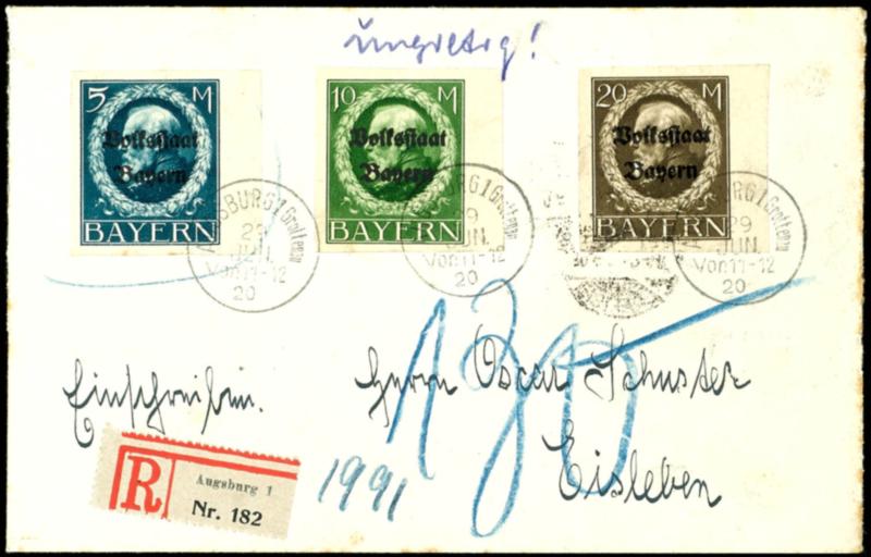 3 Pfennig - 20 Mark Ludwig geschnitten, alles Randstücke, auf vier philatelistischen R-Briefen von "AUGSBURG 29 JUN 20" nach Eisleben, alle Umschläge dreiseitig geöffnet und als Briefstücke sign. Infla/H.3 penny - 20 Mark Ludwig cut, only margin pieces, on four philatelic registered covers from \