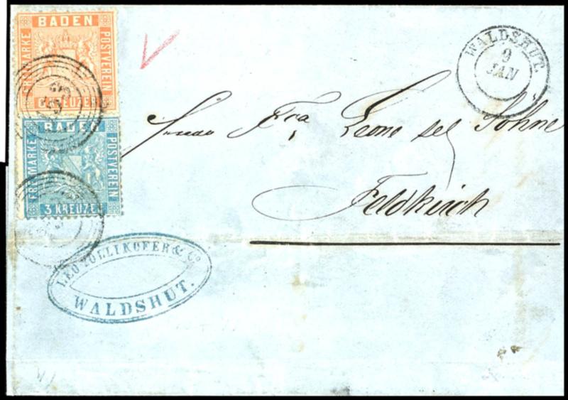 3 Kreuzer Wappen lebhaftpreußischblau zusammen mit 6 Kr. hellgelblichrot, auf um 3 Kr. überfrankiertem Faltbrief mit Nrstpl. "153" - WALDSHUT 9 JAN (1862) nach Feldkirch mit Ankunftsstempel, die 6 Kr. fehlender Eckzahn links oben und rechts flach gezähnt, die 3 Kr. gut gezähnt, beide Werte minimale