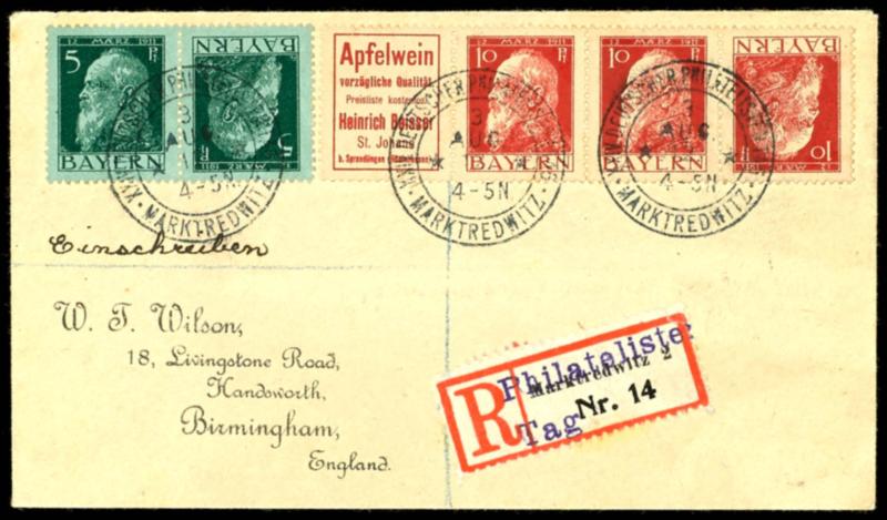 Apfelwein + 10 Pfennig mit Zusatzfrankatur auf R-Brief nach England mit Sonderstempel und Sonder-R-Zettel "PHILATELISTENTAG/MARKREDWITZ 3 AUG 12"Cider+10 penny with additional franking on registered letter to England with special cancel and special registered label \"philatelists day / MARKREDWIT