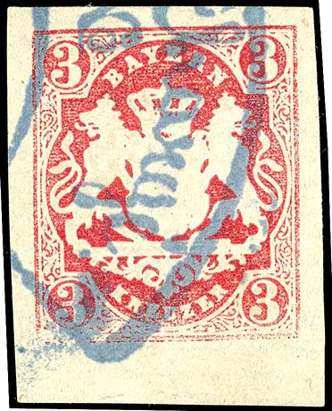 "Chargé No", violettblauer Fächerstempel zur alleinigen Entwertung auf 3 Kreuzer rosa in wundervoll farbfrischer, ringsum breit- bis überrandiger Luxuserhaltung, vom unteren Bogenrand stammend mit 4-5 mm breitem Rand, zudem auf Papier mit deutlich sichtbarer, wasserzeichenähnlicher waagerechter Stre