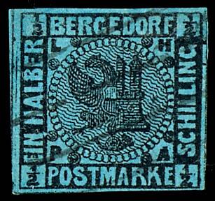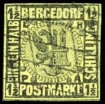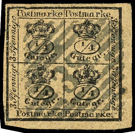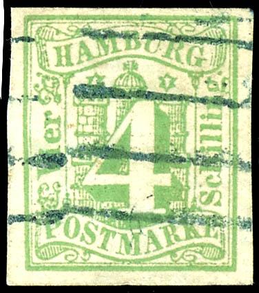 4 Schilling grün, farbfrisches und vollrandiges Exemplar, entwertet mit zentrisch abgeschlagenem Vierstrichstempel, abgesehen von einem kleinen "Papierknorpel" unterhalb der Buchstaben "AM" von Hamburg in fehlerfreier Erhaltung, Fotoattest Jakubek BPP, Mi. 1.500.-4 Shilling green, having bright c