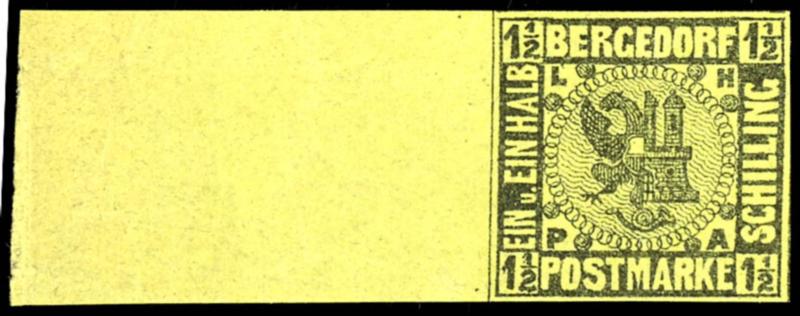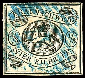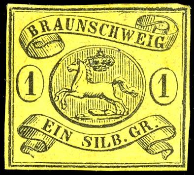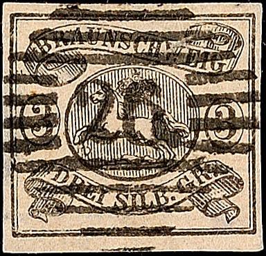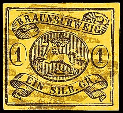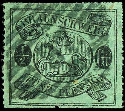 1/2 Groschen schwarz auf grünem Papier, mit bogenförmigem Durchstich 16, mit dreiseitig gutem Durchstich, unten Scherentrennung und kleine Kerbe, sonst ist die Erhaltung einwandfrei, entwertet mit Nummernstempel "37" Schöningen, entsprechendes Fotoattest Lange BPP: "Eine seltene Marke.", Mi. 4.000.-
