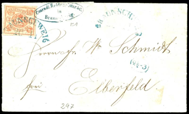3 Silbergroschen orangerot, farbfrisches und breitrandiges Kabinettstück als Einzelfrankatur auf Brief von "Braunschweig 20/11" nach Elberfeld, gepr. Engel BPP und Fotoattest Lange BPP: "Breite Ränder an allen Seiten und in feiner, farbfrischer und einwandfreier Erhaltung.", ex Sammlung Höffen3