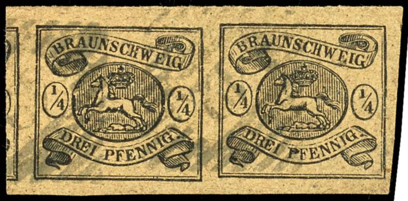 1/4 Gutegroschen / 3 Gutepfennig, waagerechtes Paar, farbfrisches und vollrandiges Kabinettstück, entwertet mit Nummernstempeln "12" (Eschershausen), tadellos, Fotoattest Lange BPP: "Die Erhaltung ist feinst, farbfrisch und einwandfrei. Dekorative Einheit.", Mi. 900.-, ex Sammlung Höffen1 / 4 Gut