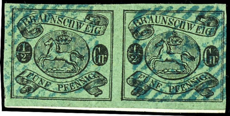 1/2 Groschen schwarz auf grünem Papier, waagerechtes Paar, voll- bis breitrandiges sowie farbfrisches Kabinettstück, entwertet mit blauen Nummernstempeln "38." (Schöppenstedt" auf kleinem Briefstück, Fotoattest Lange BPP: "in farbfrischer, einwandfreier Erhaltung, ex Sammlung Höffen1 / 2 Groschen