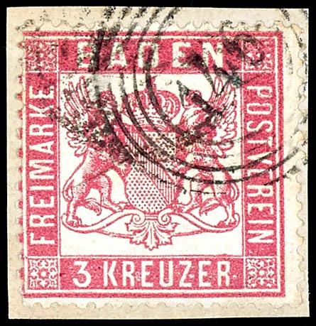 3 Kreuzer mittelrosarot, farbfrisch, mit Fünfringstempel "146" - VILLINGEN auf Kabinett-Briefstück, gepr. Bühler, Mi. 460.-3 kreuzer rose red, fresh colours, with five ring stamp \"146\" - VILLINGEN on on piece choise copy, expertized Buehler, Michel 460.- (16) (page)